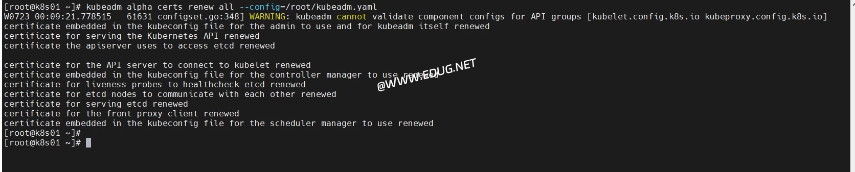 [root@k8s01 ~]# kubeadm alpha certs renew all --config=/root/kubeadm.yaml